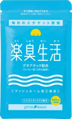 口臭予防はもちろん、体臭予防にも効果があるという「楽臭生活」のサプリメント。世界10カ国で特許を取得した150倍濃縮のシャンピニオンエキスとコーヒー豆から抽出した高濃度ポリフェノールとゴボウの酵素を組み合わせた天然由来の有用成分デオアタック®のWパワーを発揮!足・ワキ・頭皮のニオイなどの嫌な体臭なども薄くする働きがあるようです。腸内環境を整えるサポート成分も入っているので便の調子もよくなります。